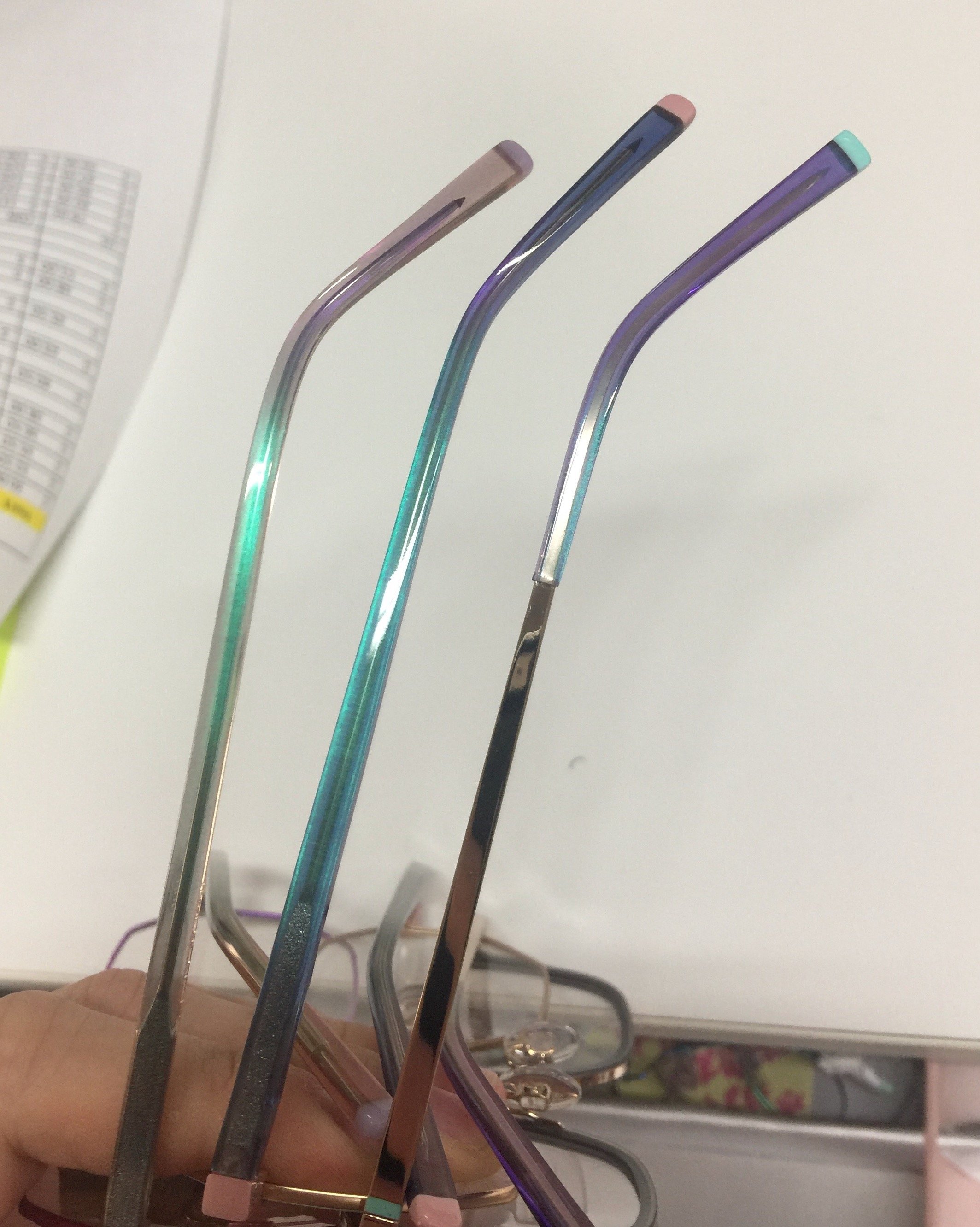 Finishes: Few facilities had the capability to produce iridescent plating on stainless steel. I worked with several vendors to develop iridescent platings that would comply with rigorous eyewear testing standards, delivering a novel plating color previously not seen in the eyewear market.